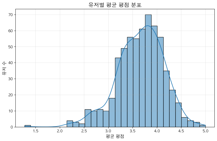 - 평균 평점은 약 3.5점으로, 유저들은 일반적으로 긍정적인 평가를 많이 남기는 경향이 있다.